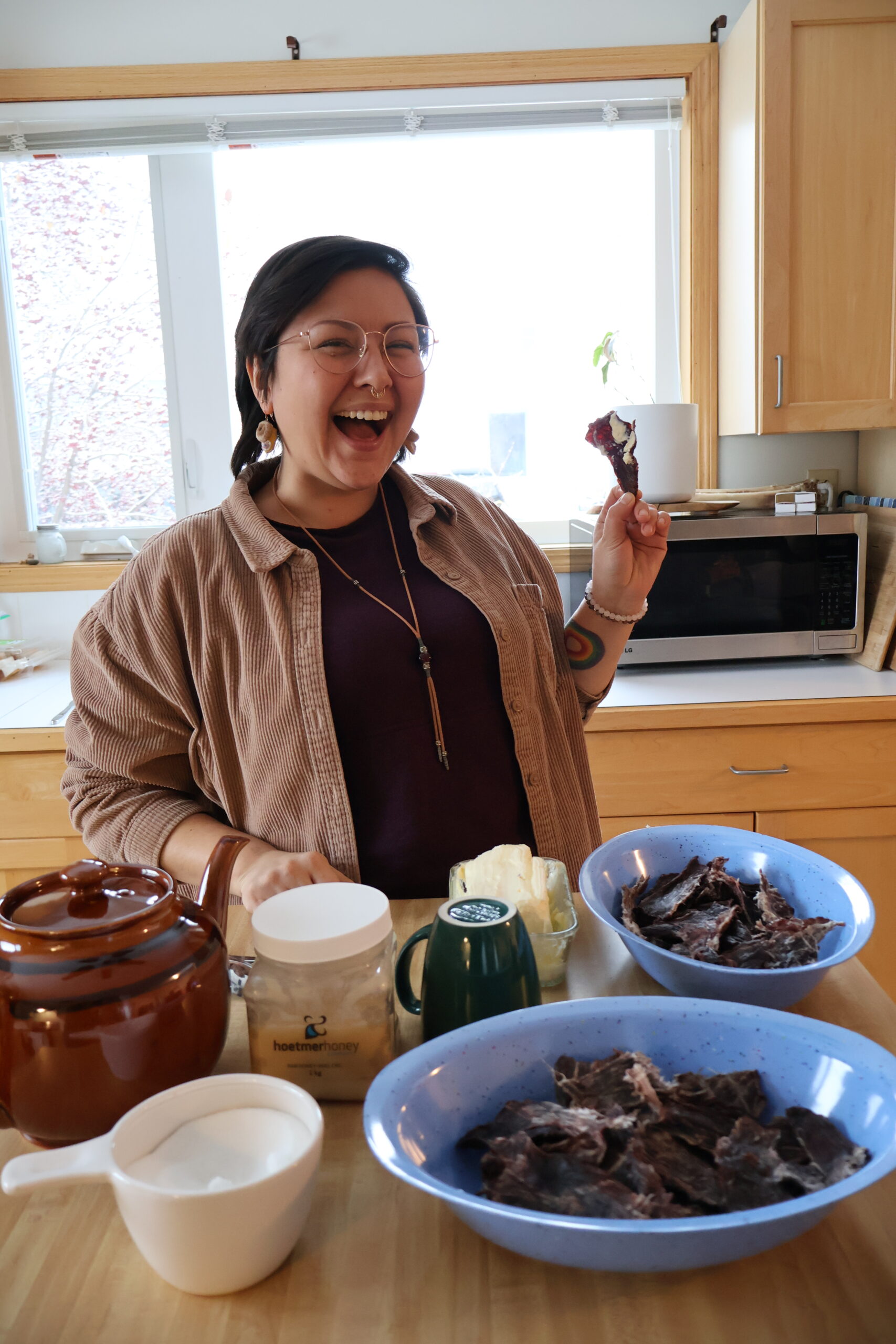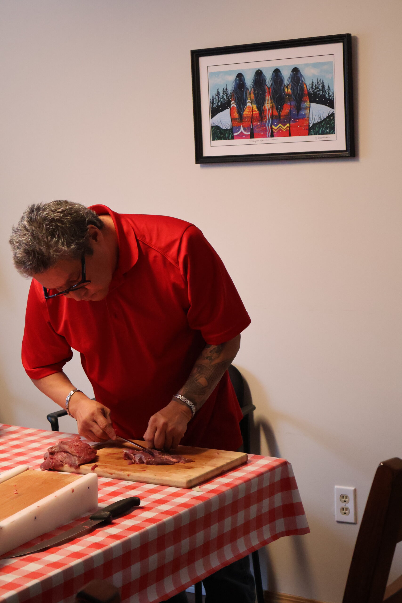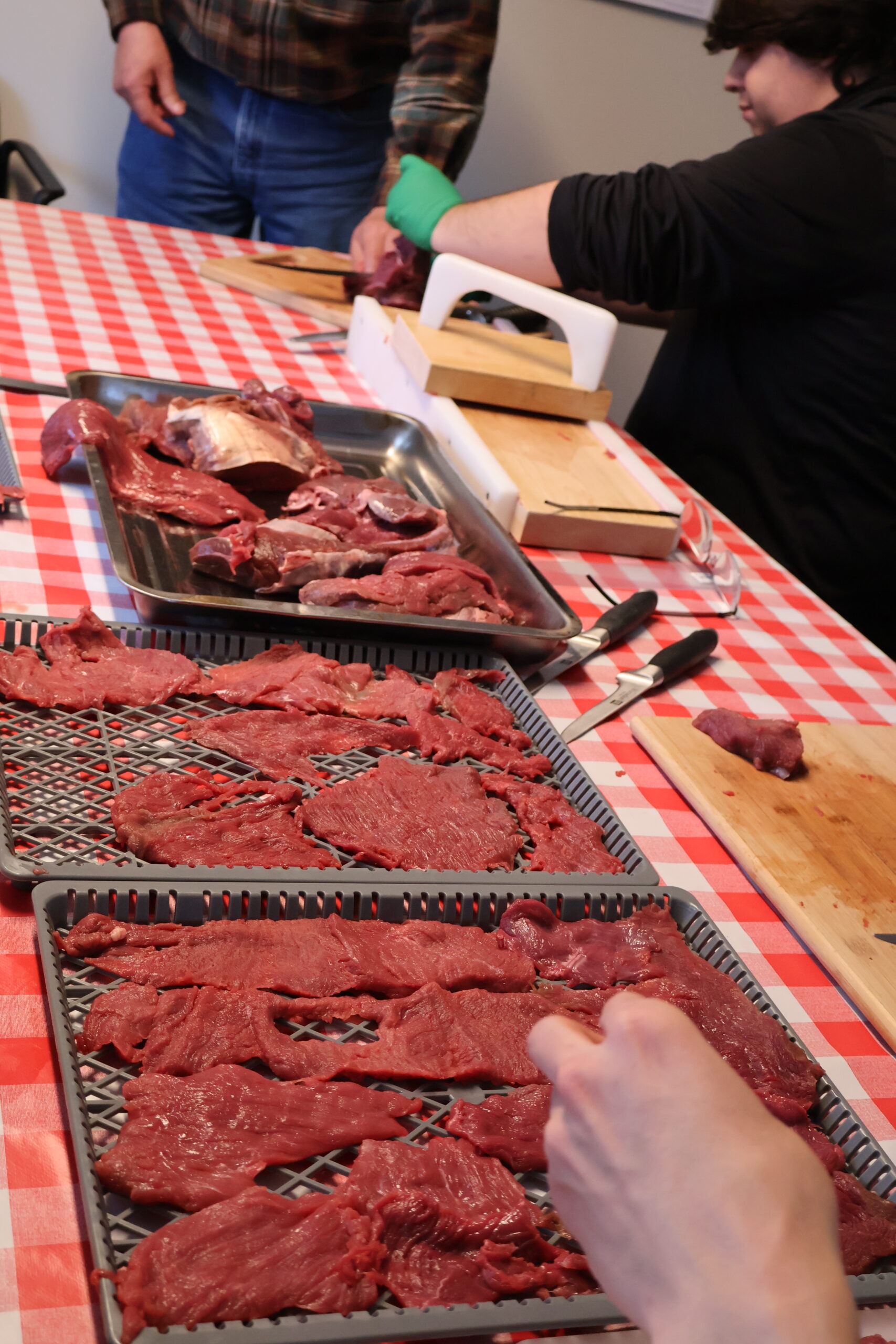 One afternoon was spent making dry meat with Kenny: everyone got hands-on experience cutting moose meat, skinning, learning which knives to use, and preparing different cuts. Laughter echoed as Kenny shared hunting stories and participants swapped funny mishaps. Many reflected the next day that this experience helped to ground them and allow them to reconnect and focus more fully on the material.