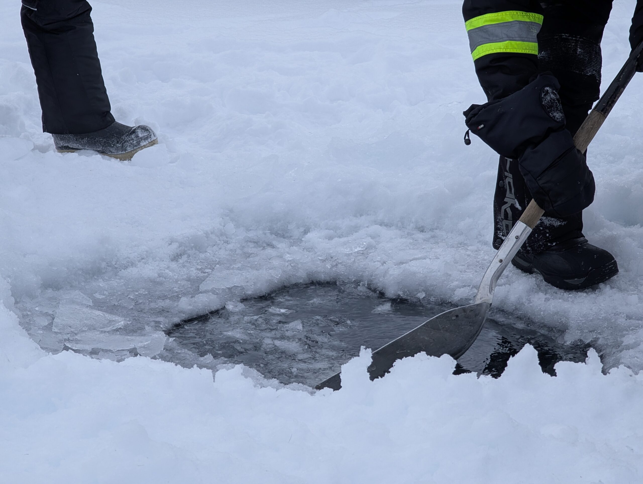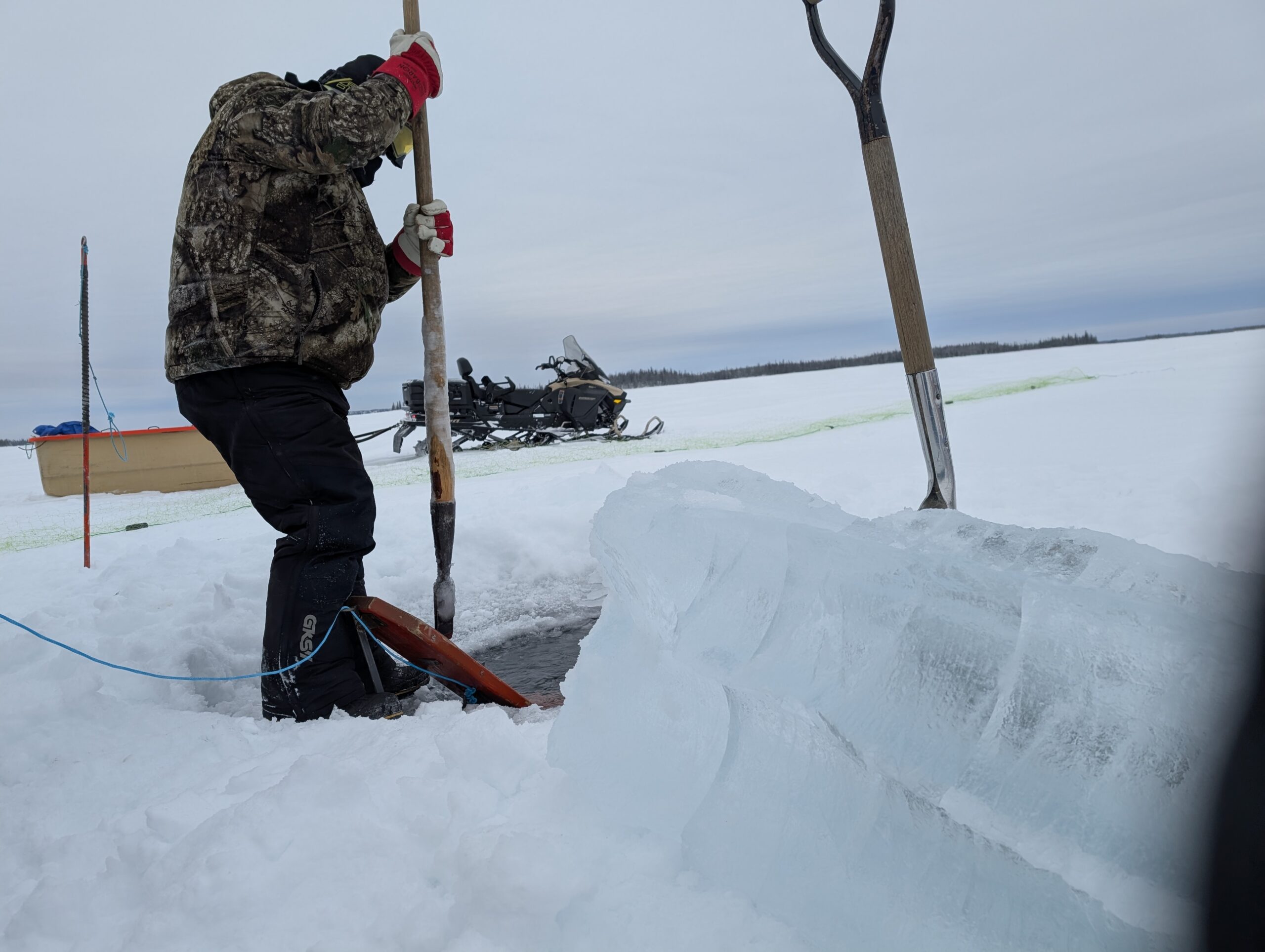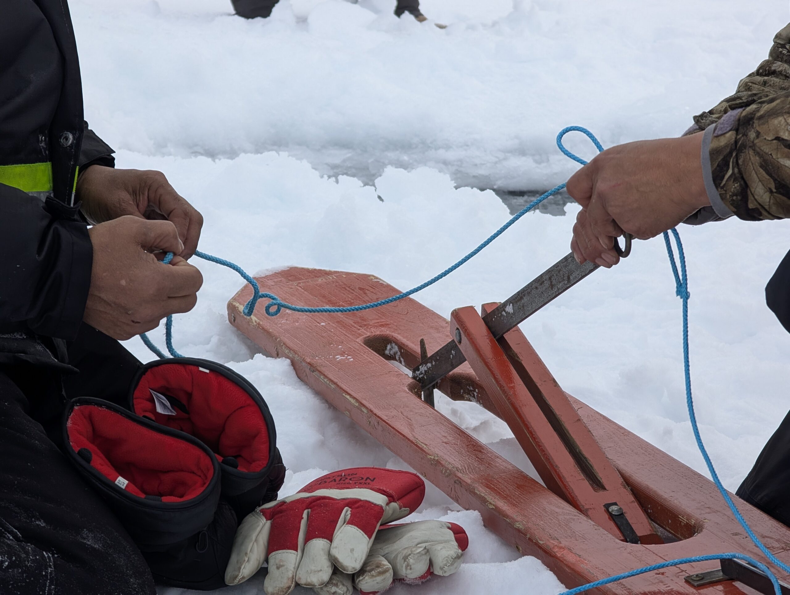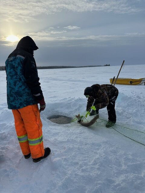 Although most of the training took place in town, the group spent Tuesday and Thursday afternoons out on Wha Ti (Lac La Martre, or Marten Lake). On Tuesday, the group snowmobiled out to the cabins of the Whatì Healing Camp, then set a fish net in the lake. Everyone took turns drilling a hole in the ice, and feeding the jigger through with expert tugs at the rope. The net was finally set after the fog from the ice was cleared away, and the jigger could be seen from above.